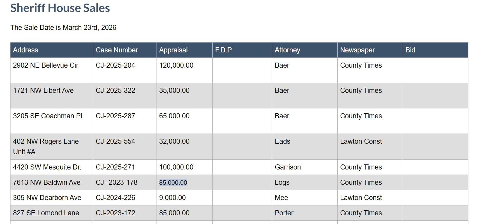 Listing of house sales should be available here on the Comanche County Sheriff's website at https://sheriffcomanche.com/Sheriff-Sales.html and at the Comanche County website at https://www.comanchecountyok.gov/228/Sheriff-House-Sales.